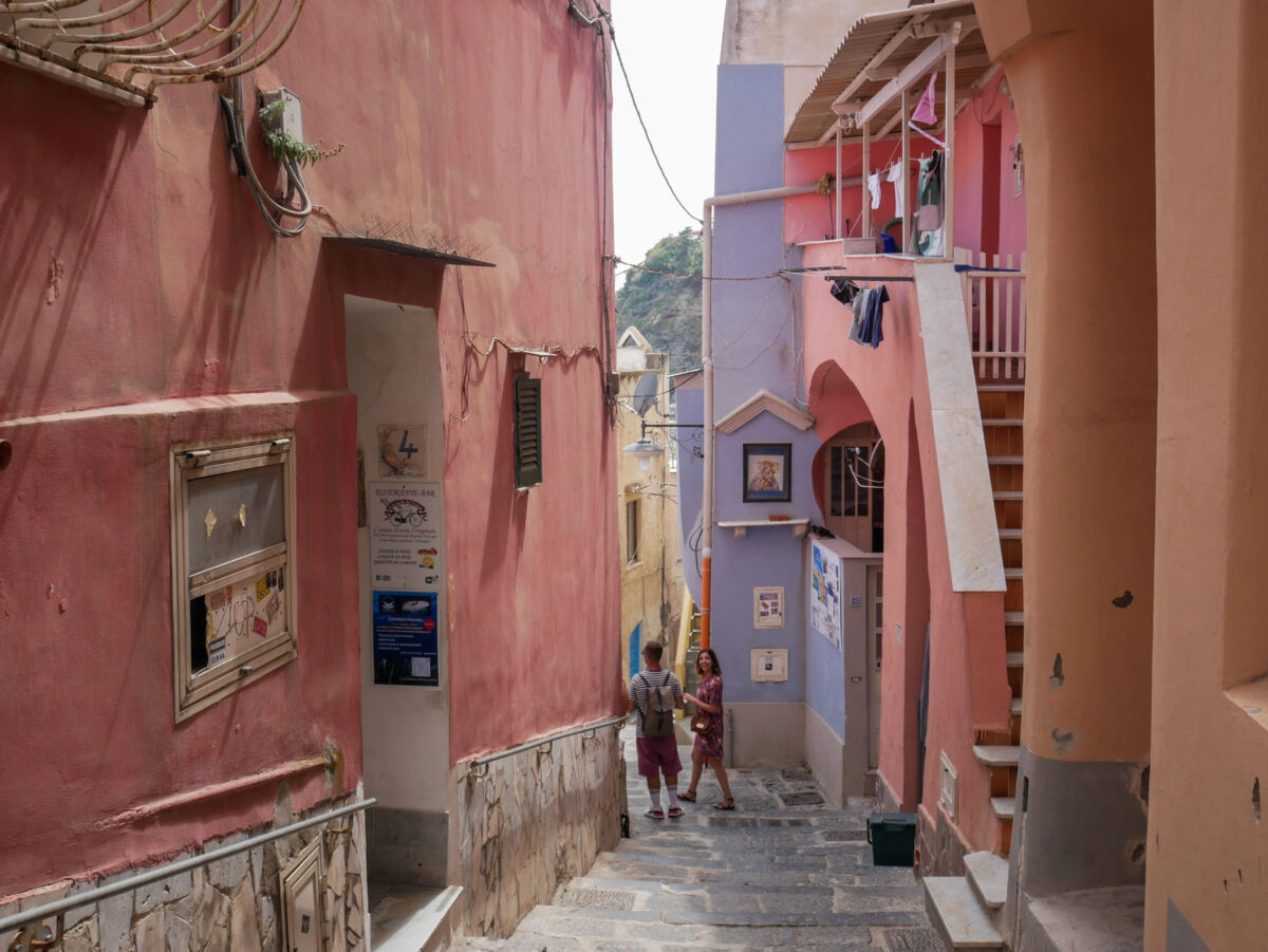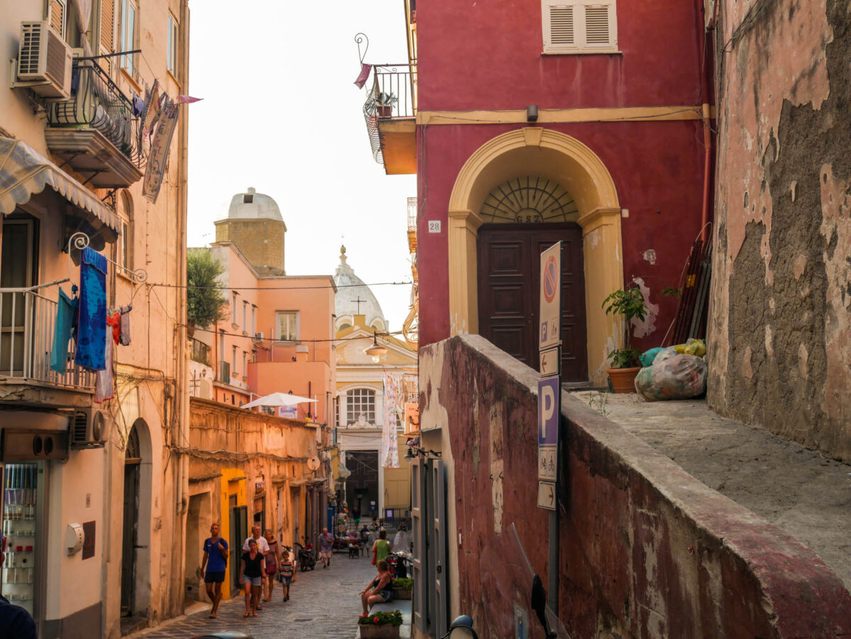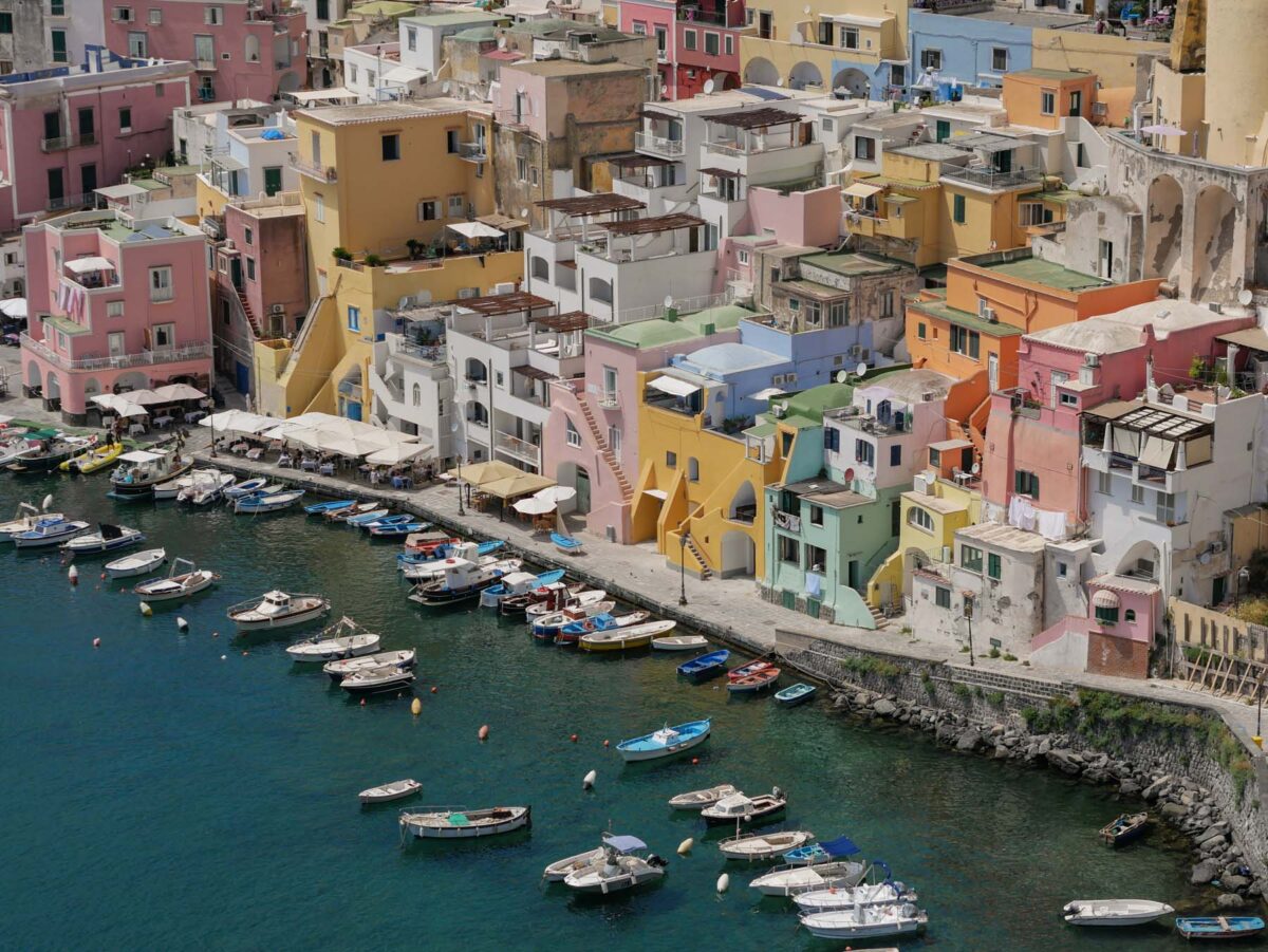 Marina Corricella serves as a typical example of a settlement built around Terra Murata. Nestled on an amphitheatrical hill, the village offers splendid vistas of the Mediterranean. Its defining feature lies in the charming, multi-colored houses of Corricella, stacked atop one another, adorned with delightful terraces and facades painted in shades of ocher, soft pink, blue, lilac, and white. Along the coastal perimeter, pathways wind their way to small beaches and reefs, while inland walkways unveil beautiful landscapes and vast panoramas. The picturesque central road is flanked by patrician palaces dating from the 16th to the 19th centuries, their gardens cascading in tiers towards the sea.