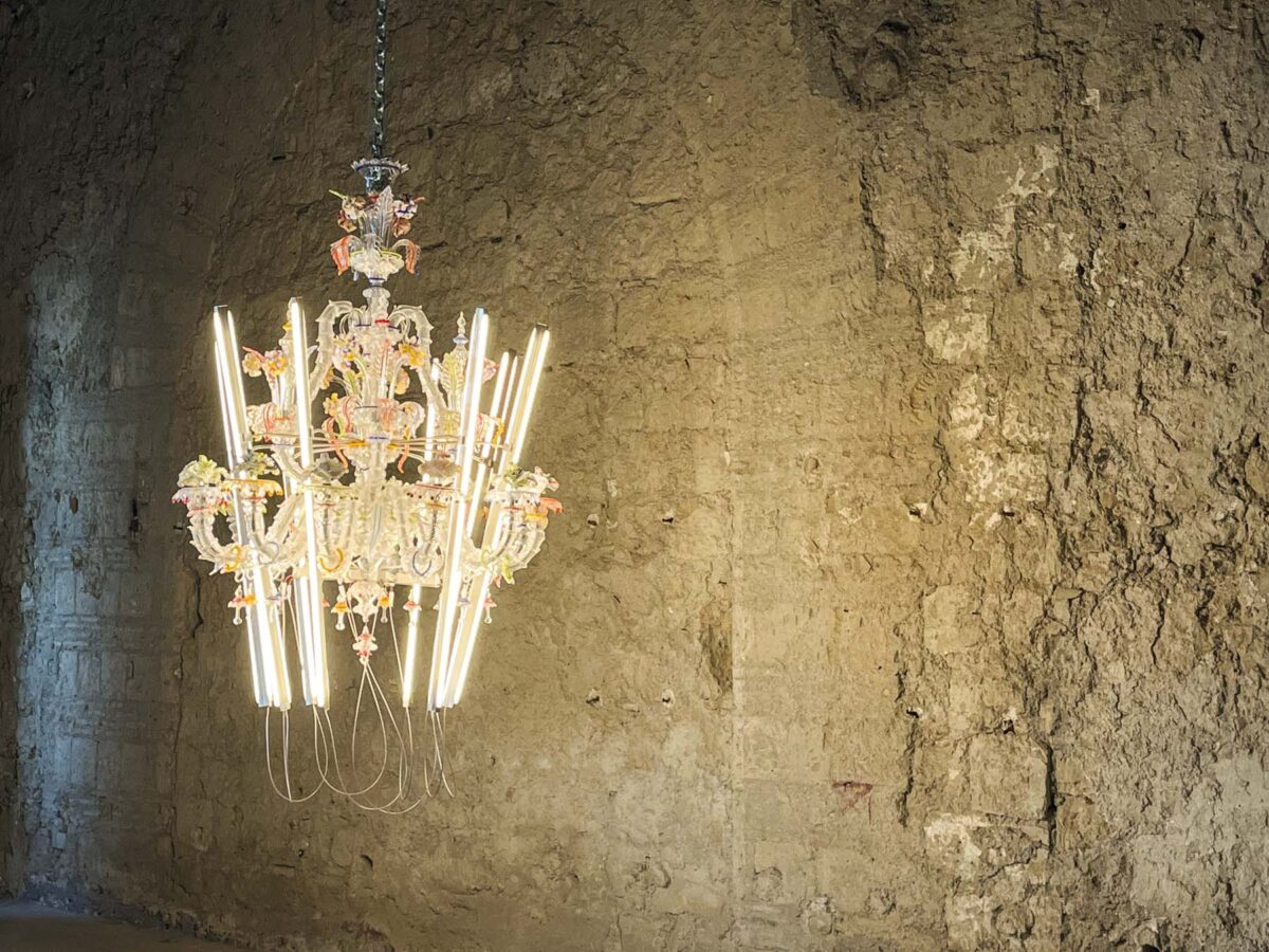 In the art installation “Nine to five,” Andrea Anastasio alludes to the conventional 8-hour workday that typically shapes people’s daily routines. Here, this concept is embodied in a faithful reproduction of a 17th-century Venetian chandelier, complemented by 8 elongated LED ceiling lights. Its circular form and radial arrangement evoke associations with festivities, popular amusement parks, and aristocratic grandeur.