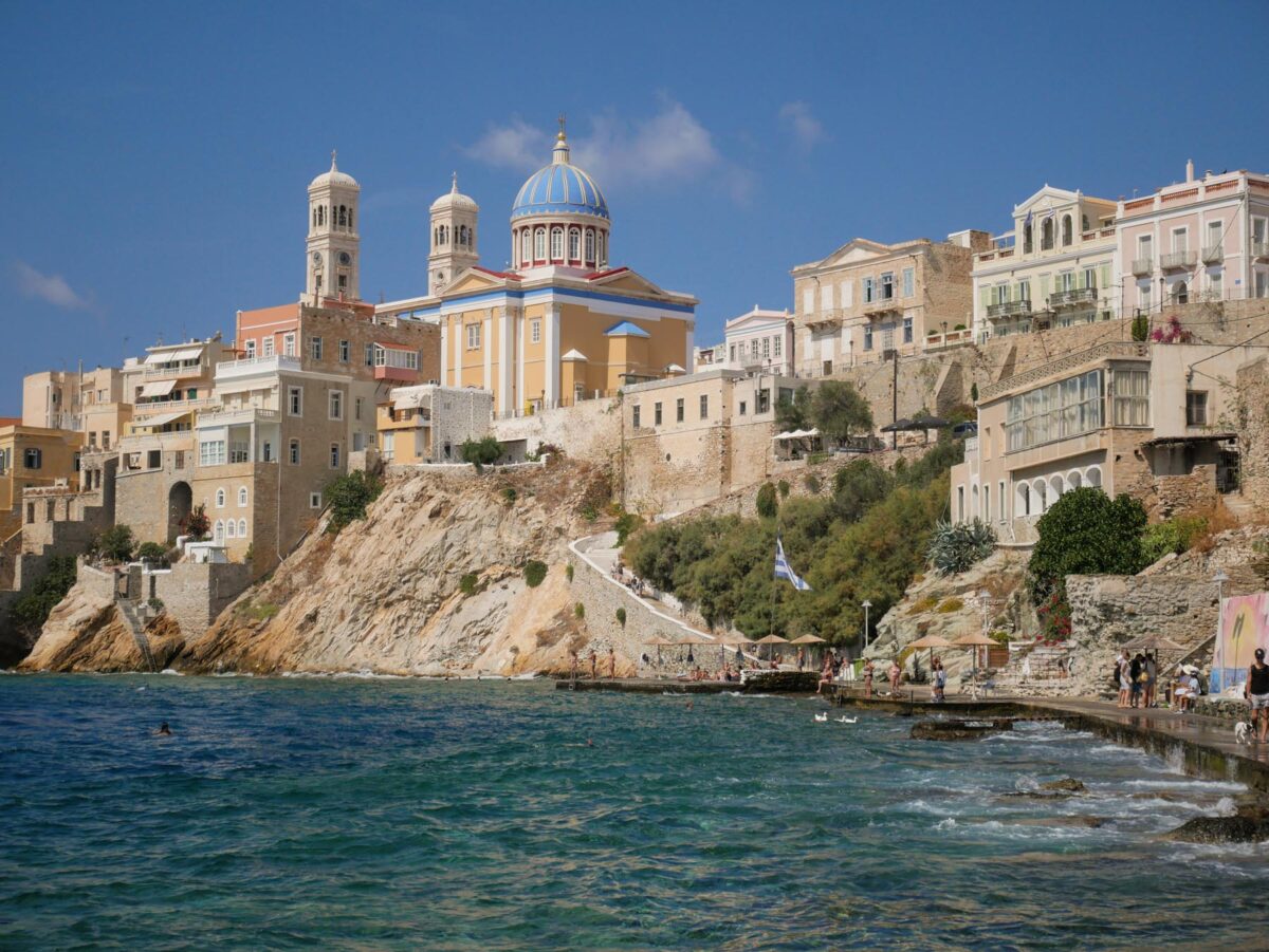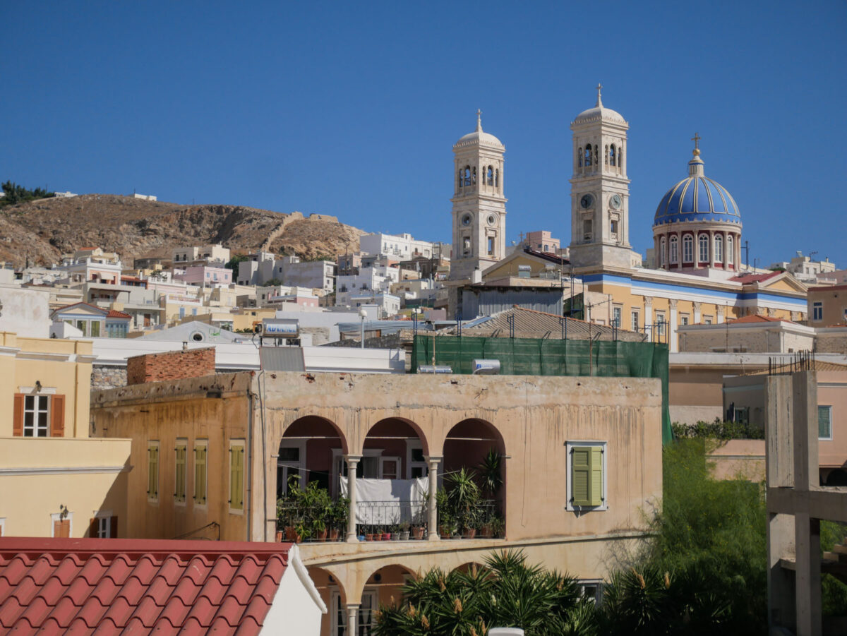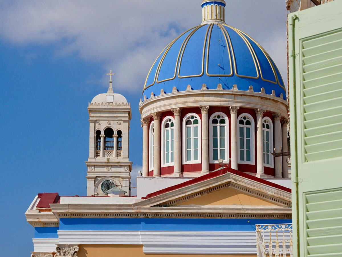 ‘Vaporia’ – literally meaning ‘boats’ – is an elegant district in Ermoupolis, the capital city of Syros, where shipowners had their elegant mansions built in the 19th century. The blue dome belongs to the Church of St. Nicholas, the patron saint of sailors.