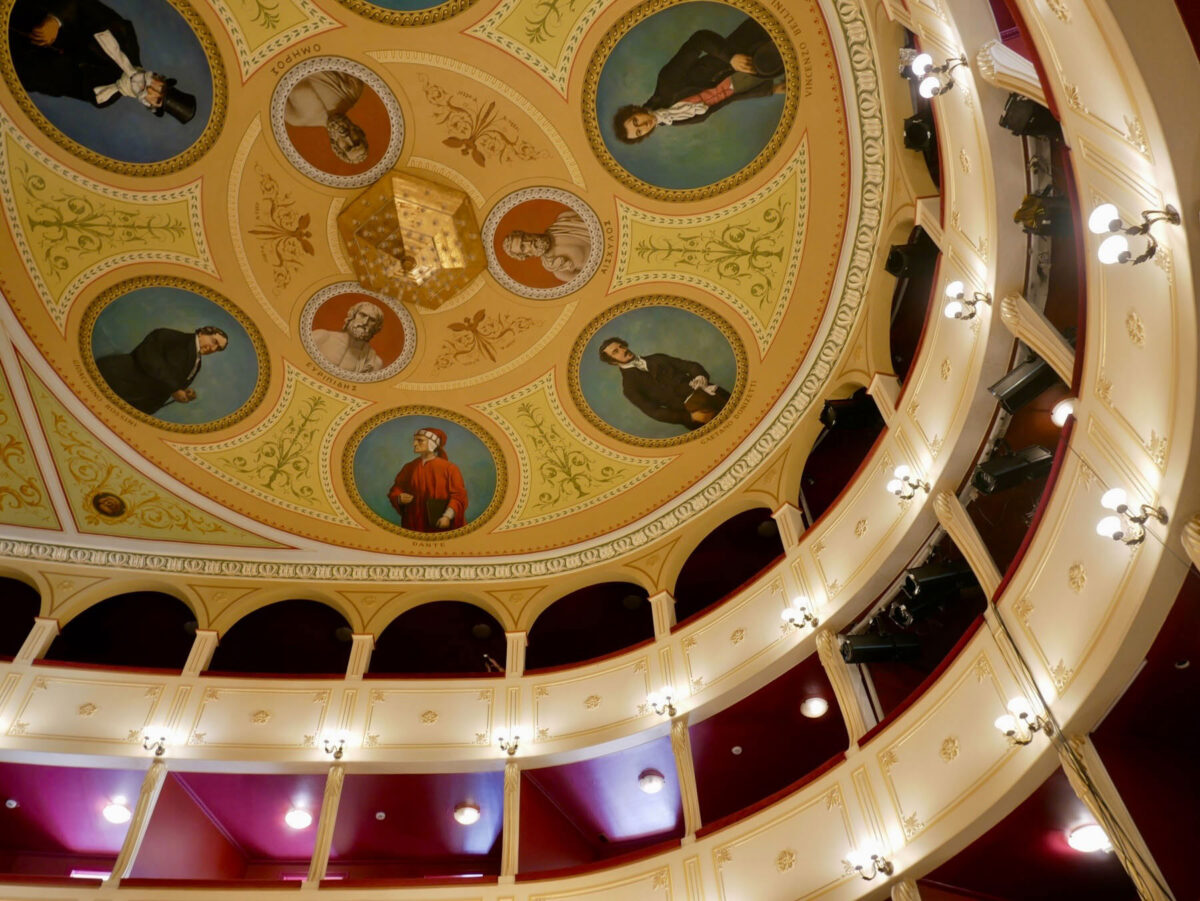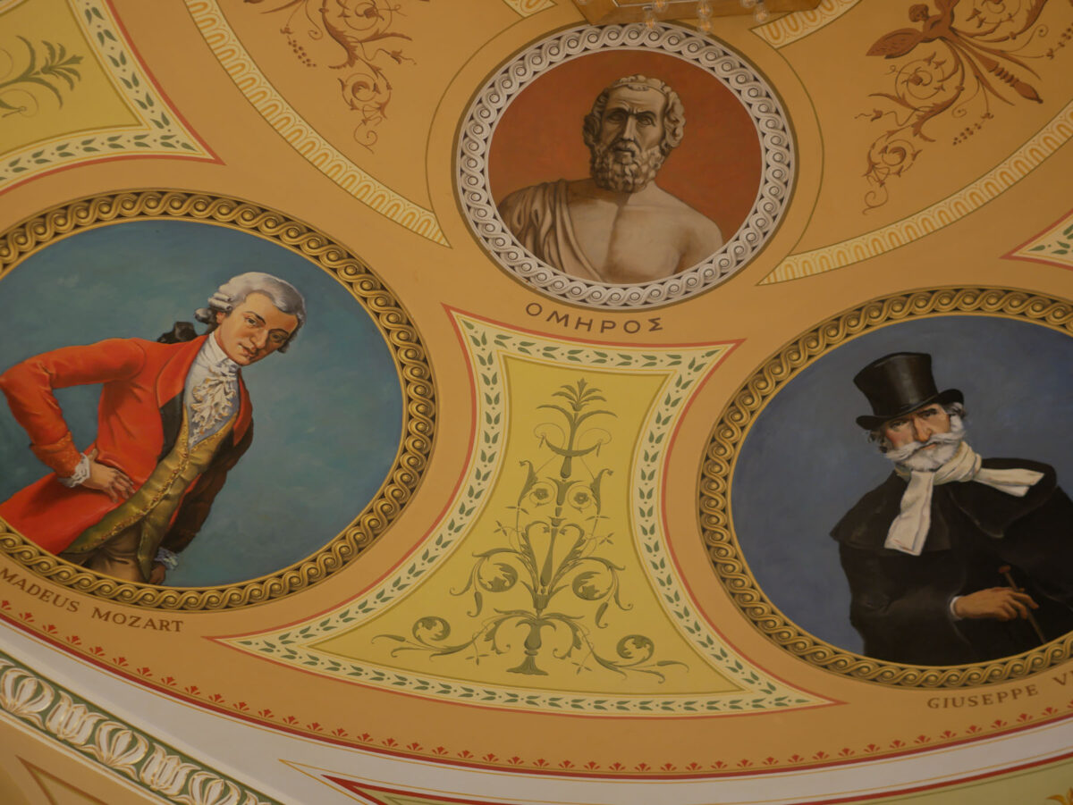 The dome of the Apollon Theater House features emblematic composers of classical music, such as Mozart and Rossini, opera composers like Verdi and Donizetti, and iconic writers such as Homer, Aeschylus, and Euripides.