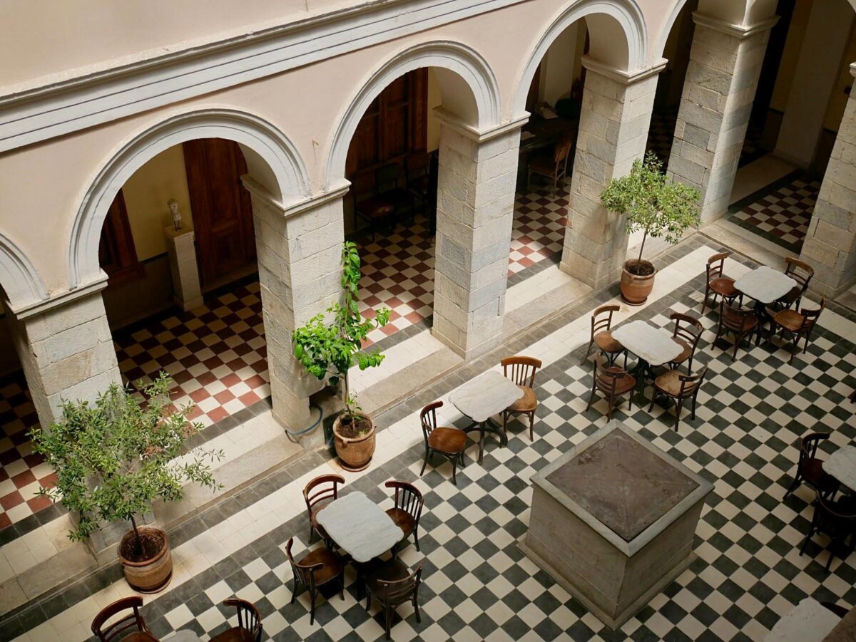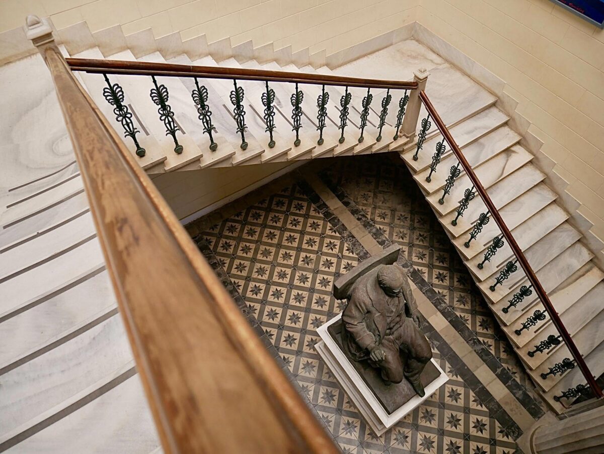 The elegant marble staircase surrounds the statue of Dimitris Vafiadakis, who served as Mayor of the island from 1870 to 1887 and again from 1895 to 1898.