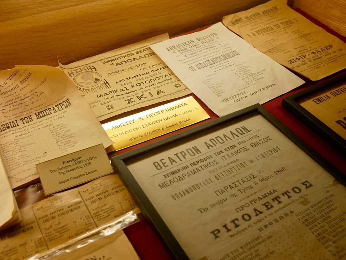 Memorabilia showcased at the Apollon Theater Museum include billboards, play programs, and personal belongings of the actors.